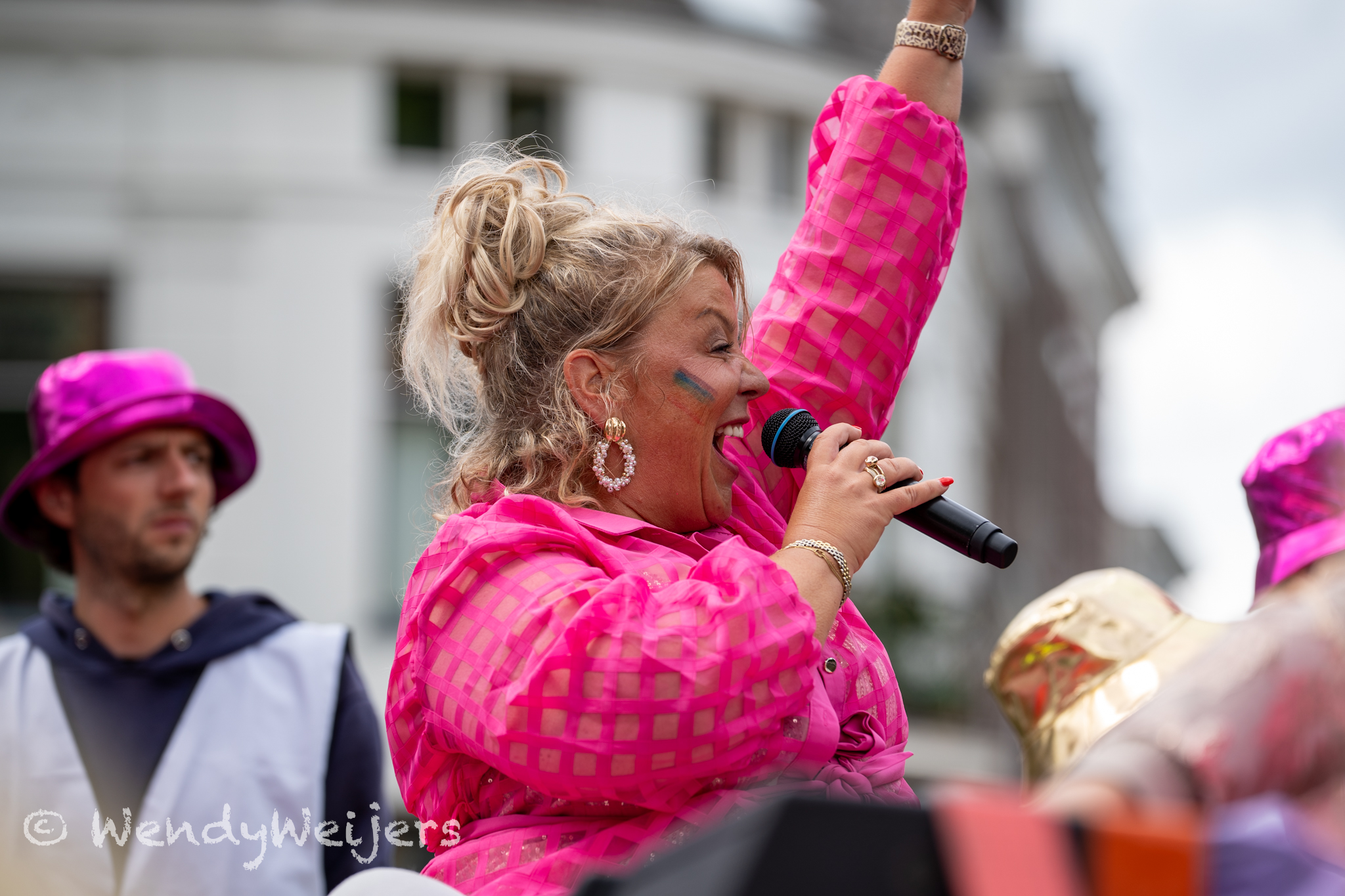 Of het nu een feesttent, bedrijfsborrel of Pride-boot is — zodra Britt het podium op stapt, spat de energie eraf!